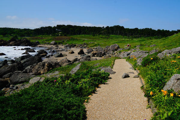 遊歩道沿いに海浜植物と高山植物が咲き誇る、「花の渚」種差海岸を代表するスポット。