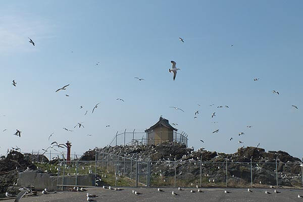 昭和初期までは島でしたが、現在は大久喜漁港と陸続きとなっている弁天島にある神社で、ウミネコの繁殖地となっています。