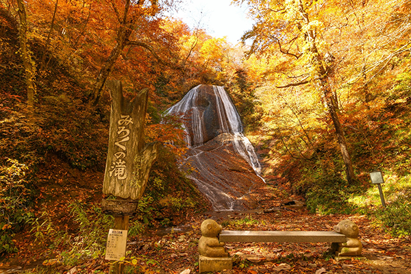 静寂なブナの原生林に囲まれた遊歩道を入り口から5分ほど歩くと、高さ約30m、幅約20mの「みろくの滝」が現れます。幾条もの細い糸を引いて巨大な岩肌を滑り落ちるので、地元では「そうめんの滝」とも呼ばれています。「みろく」の名の由来は、室町時代の初めに弥勒菩薩を信仰し、この滝の元で修行を積んでいた「キュウ岳坊」というお坊さんにちなんで付けられました。