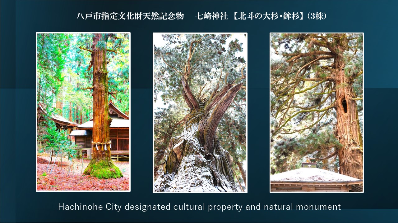 伝承によると、創建時に地域の安泰を願い「北斗七星」をかたどり7株の杉を植樹したとされています。そのうち3株(北斗の大杉と鉾杉2株)が八戸市指定文化財天然記念物として、現在でも、平安が息づく鎮守の杜の静けさを保っています。