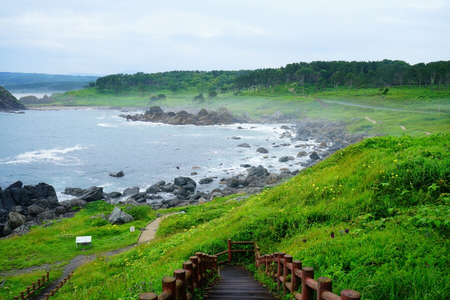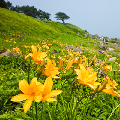 初夏の遊歩道沿いにはハマヒルガオ・スカシユリなどの海浜植物と、ニッコウキスゲ・ノハナショウブなどの高山植物が隣り合って咲く希少な場所で、幻想的な雰囲気を醸し出します。