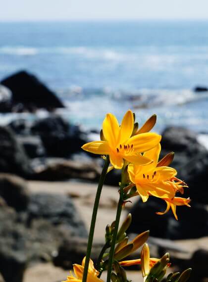 岩礁の入り江に整備された遊歩道沿いに花々が咲き誇る、「花の渚」とも呼ばれる種差海岸を代表する景観の一つ。
