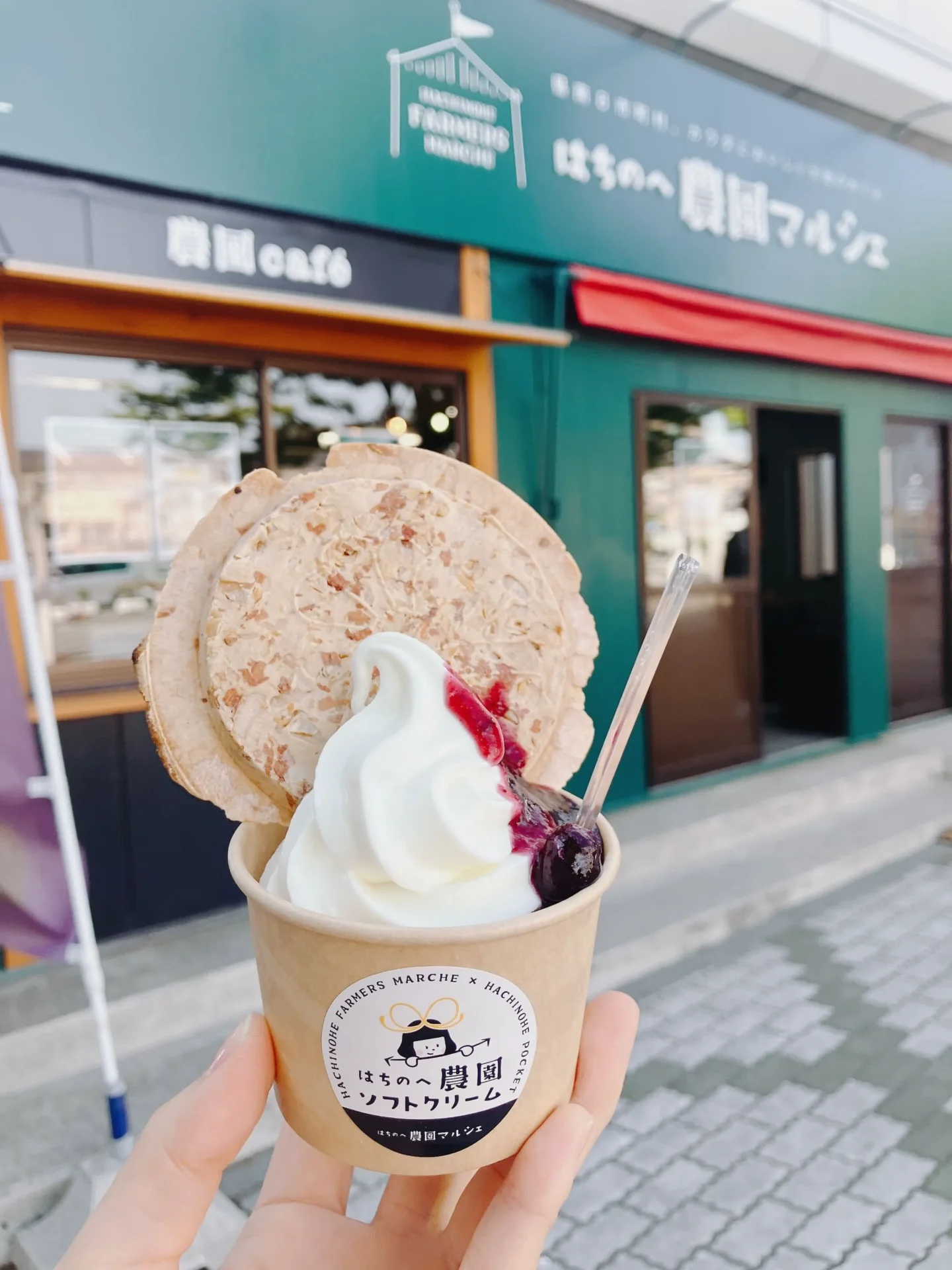 2024年4月、八戸駅東口にオープンした〈はちのへ農園マルシェ〉。ここでは、トッピングを自由に組み合わせる「はちのへ農園ソフトクリーム」が食べられます。