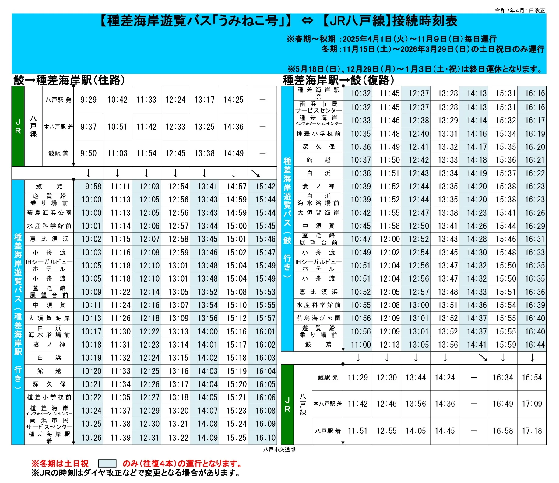 - https://www.city.hachinohe.aomori.jp/section/bus/onecoin_uminekogou.html(八戸市交通部)