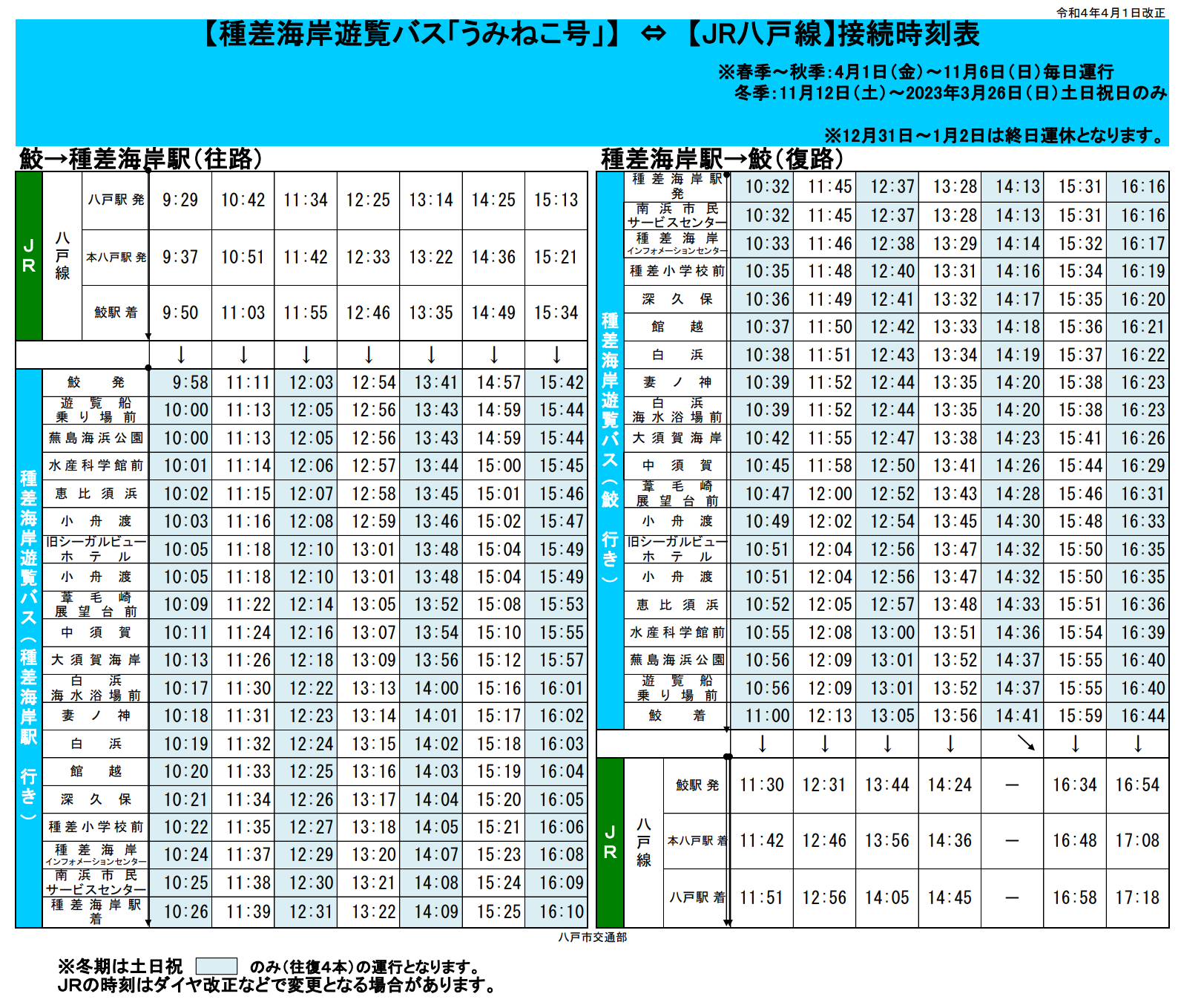 - https://www.city.hachinohe.aomori.jp/section/bus/onecoin_uminekogou.html(八戸市交通部)