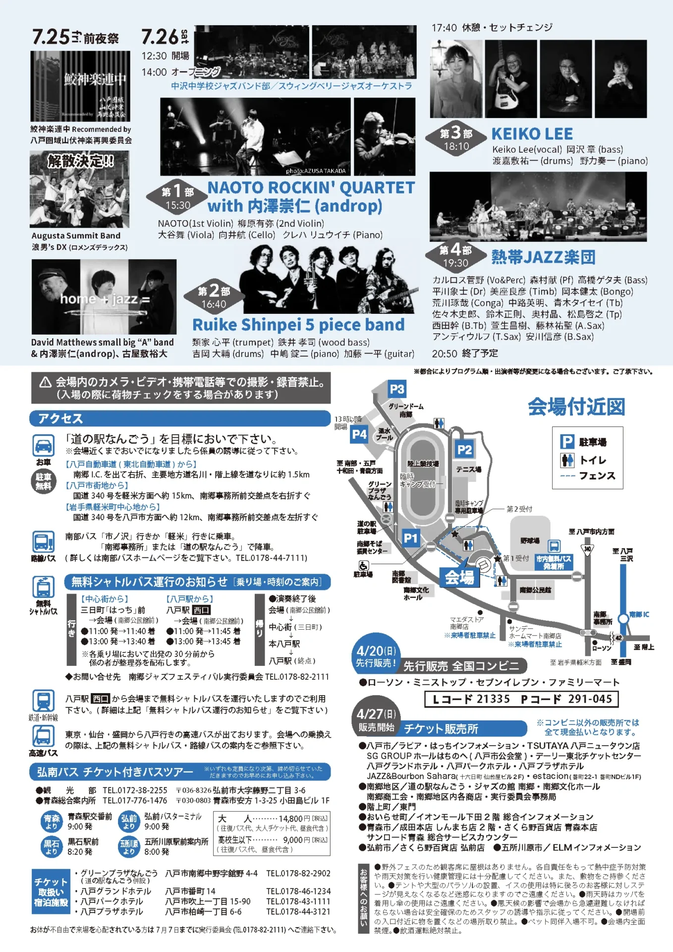 また、25日(金)には前夜祭を開催。鮫神楽連中(八戸圏域山伏神楽再興委員会推薦)、Augusta Summit Band 浪男’s DX、David Matthews small big “A” band & 内澤崇仁(androp)、古屋敷裕大さんが出演します。