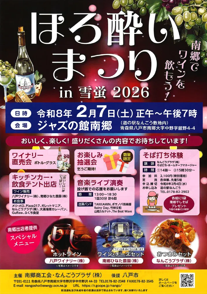 ※南郷でワインを飲もう!ほろ酔いまつりin雪蛍のお問い合わせは南郷商工会(0178-82-2348:平日のみ8:30~17:00)まで。 - その他